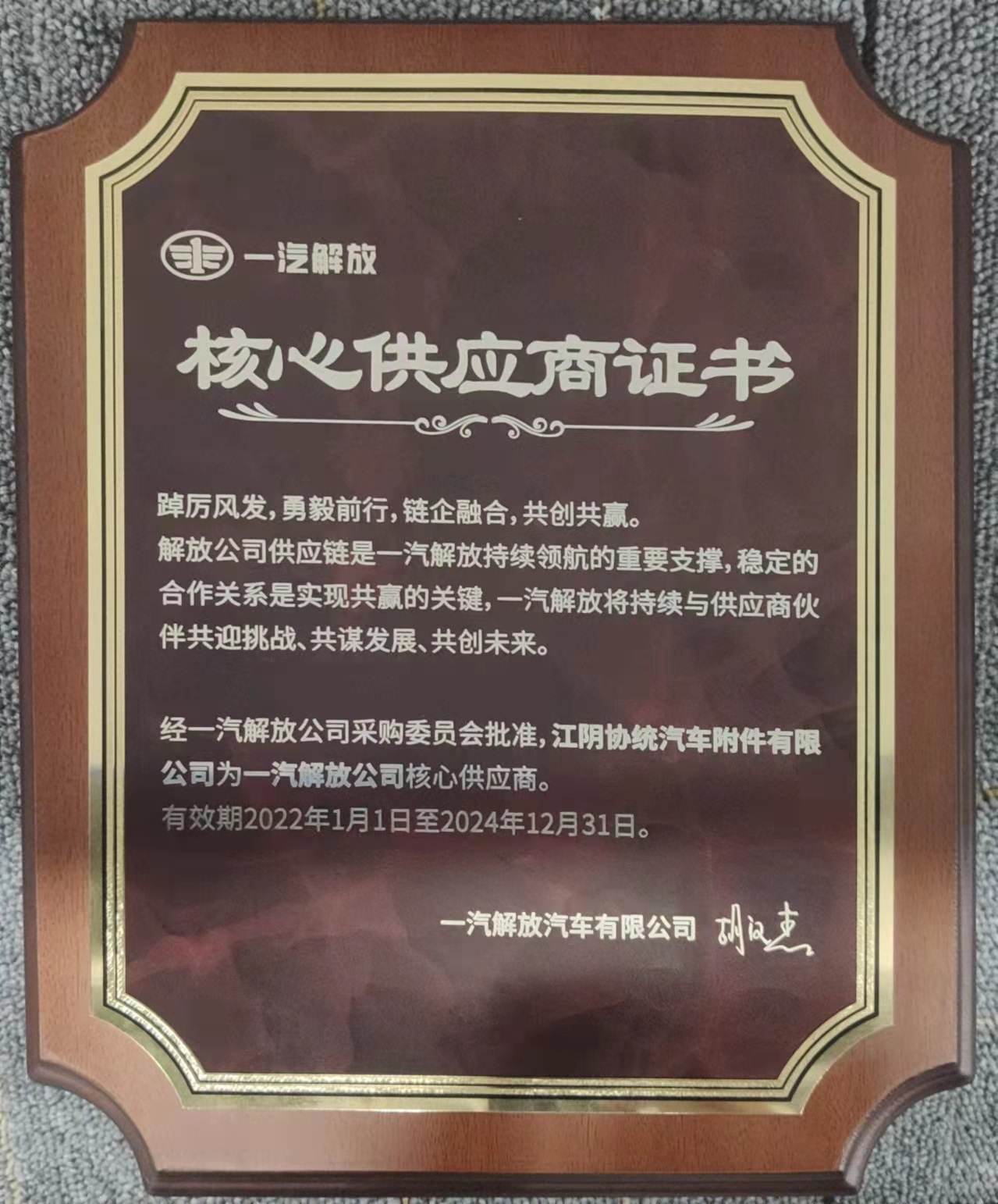 喜報!江陰協(xié)統(tǒng)榮獲一汽解放核心供應商獎